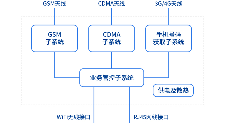 系統(tǒng)支持制式包括2G通信的GSM和CDMA-1X制式,3G通信的WCDMA、TDSCDMA和CDMA-EVDO,4G通信的TDD-LTE和FDD-LTE。設(shè)備內(nèi)部由GSM子系統(tǒng)、CDMA子系統(tǒng)、業(yè)務(wù)管控子系統(tǒng)和供電散熱單元構(gòu)成,各業(yè)務(wù)系統(tǒng)之間通過以太網(wǎng)網(wǎng)線相互溝通,同時,業(yè)務(wù)管控子系統(tǒng)通過網(wǎng)線或Wi-Fi與外界進行信息溝通。